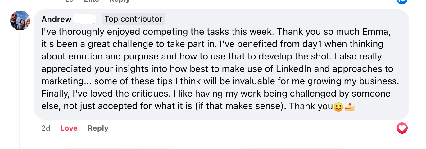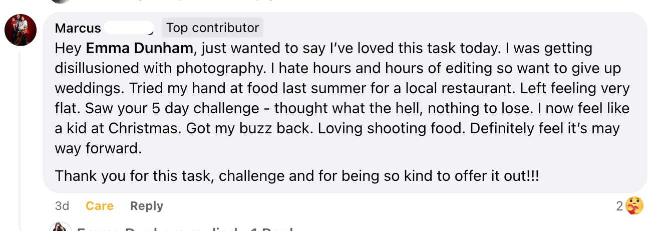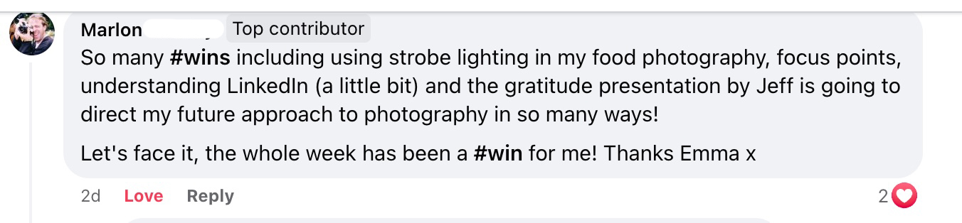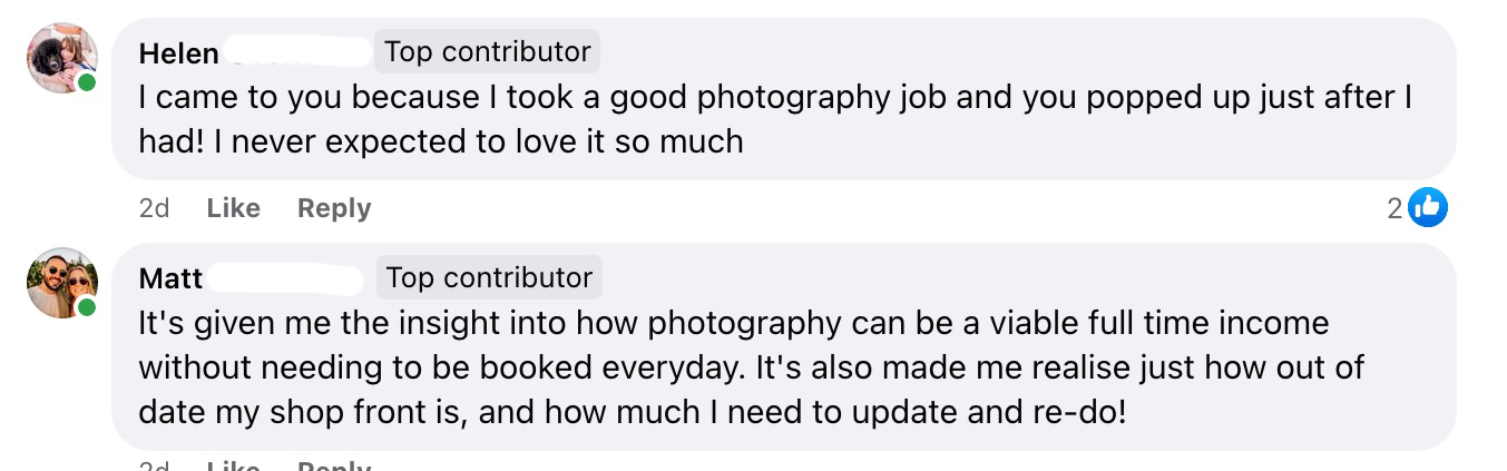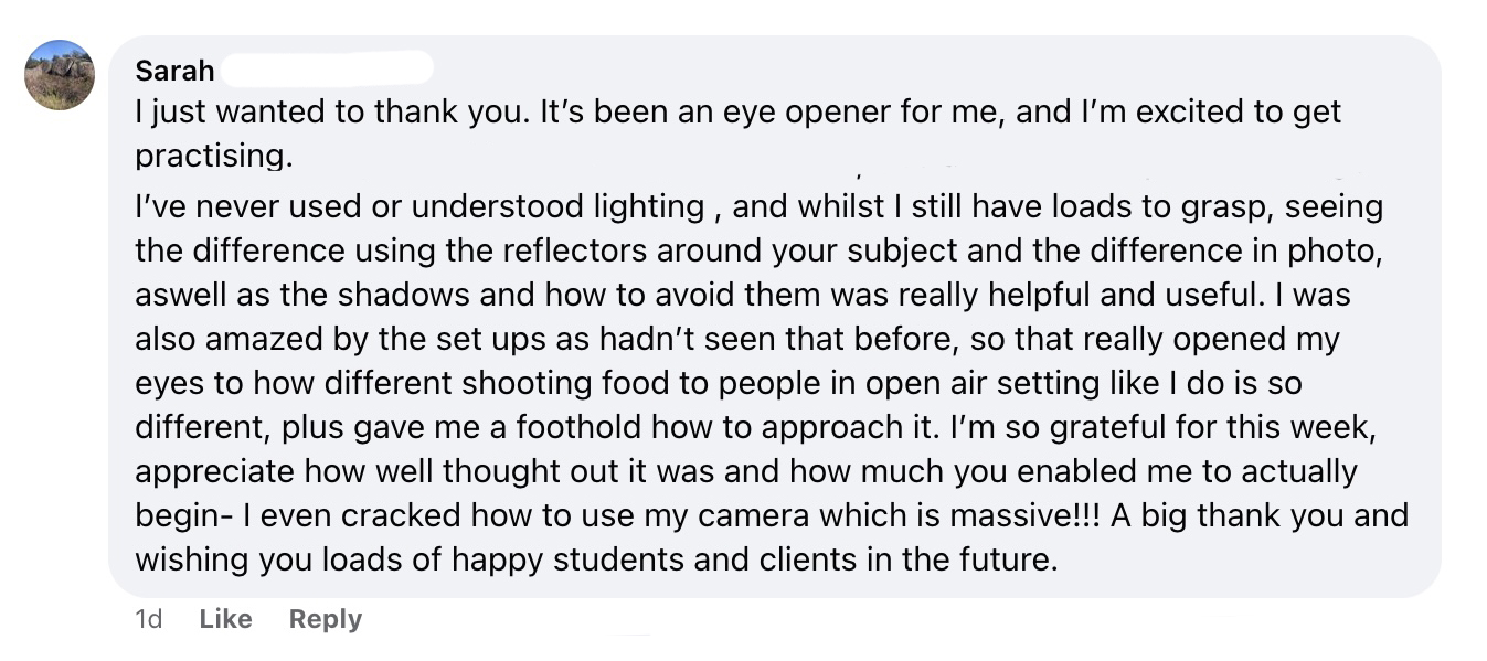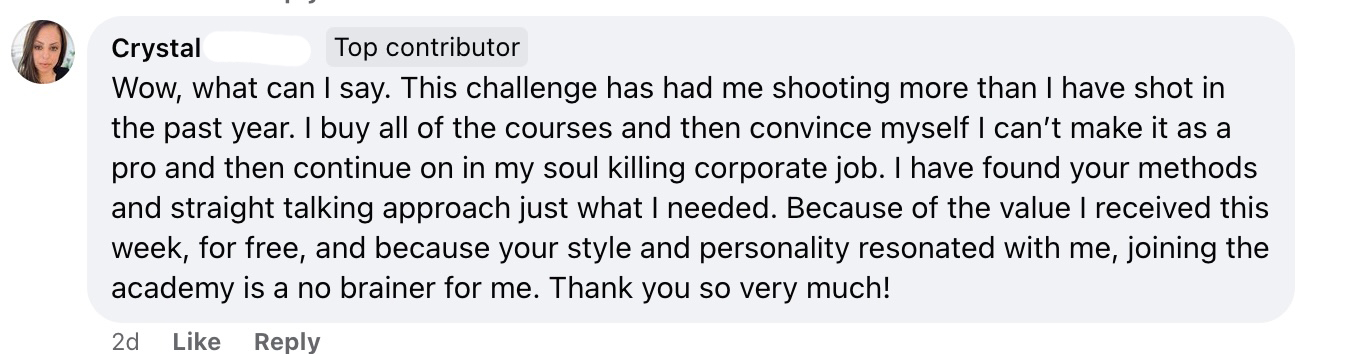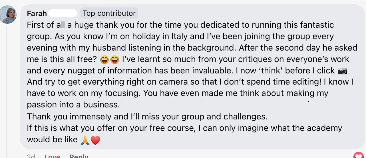 Feedback & Support. This isn’t just throwing info at your type of training. You’ll be given access to my private Facebook group where each day I’ll release a short video lesson and workbook to guide you through that day's training.. But that's not all! Each day you’ll be able to ask questions and I’ll answer them on a daily live stream each evening whilst I am critiquing YOUR photos!